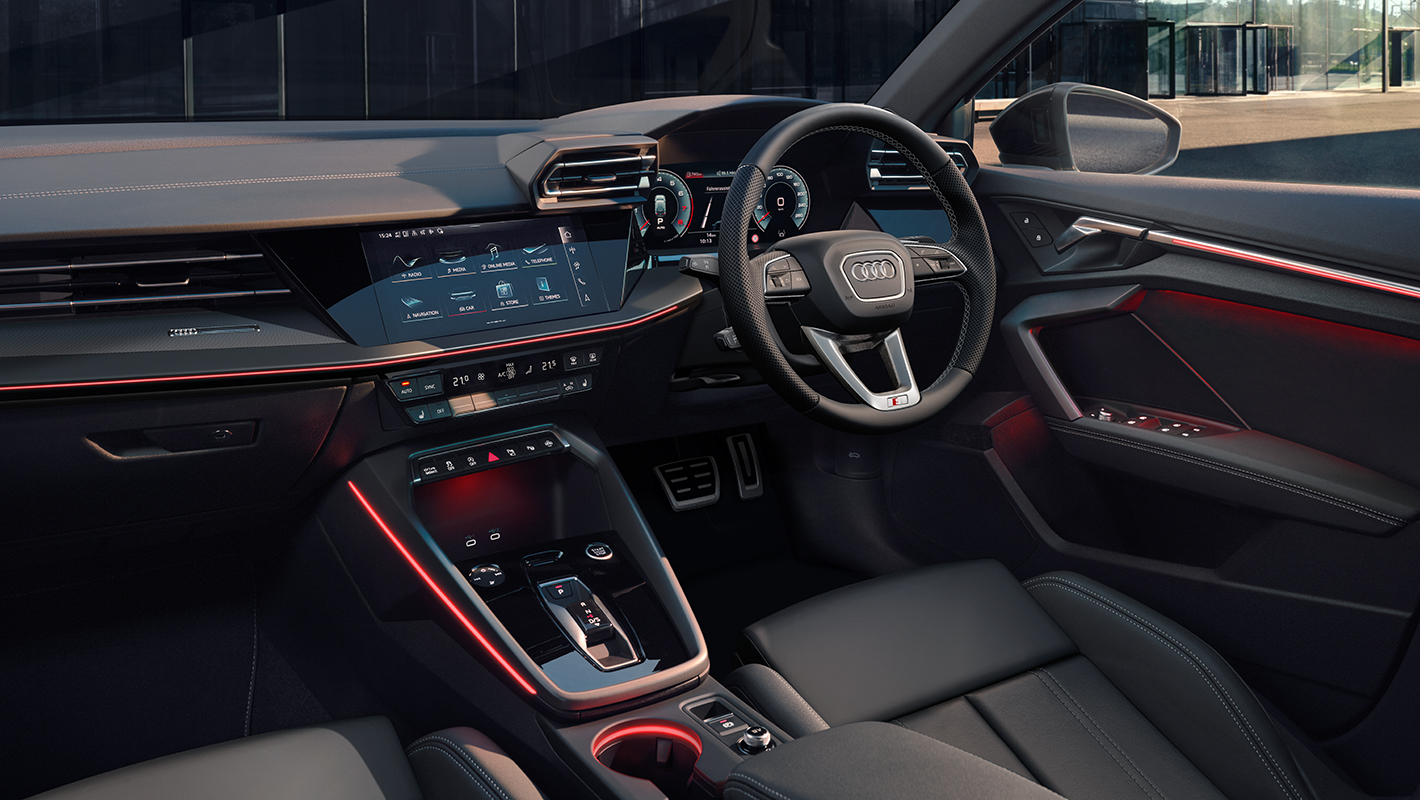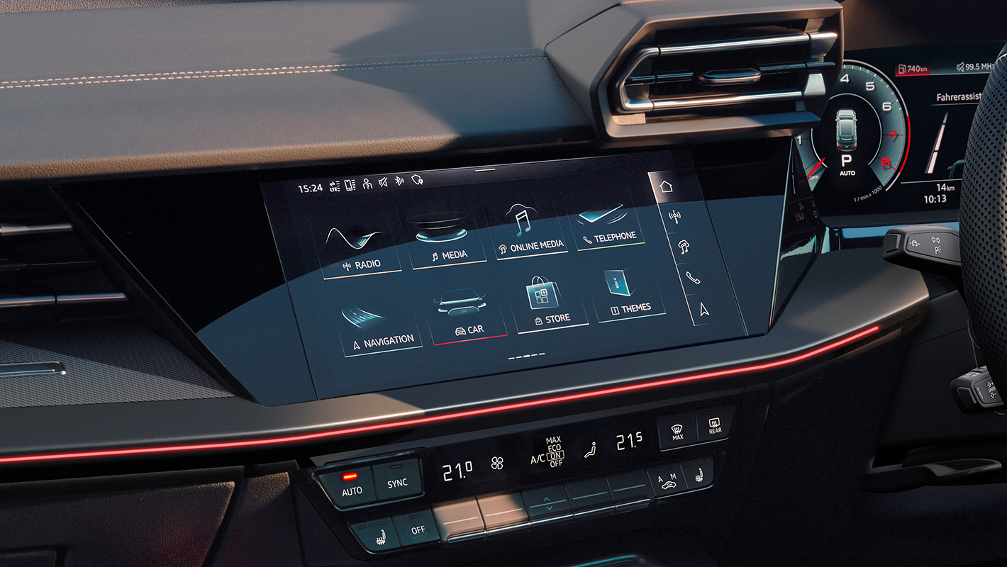 ボディサイズにとらわれない快適性とラゲッジスペースを備えるAudi A3のインテリア。質感高く設えられた空間は、プレミアムな印象を醸成しながら見事に先進テクノロジーと融合します。シフトスイッチは新たなデザインへと刷新。よりフラットな形状になりセンターコンソールにシームレスに溶け込むことで、空間との調和を増しながら操作性の向上も果たしました。