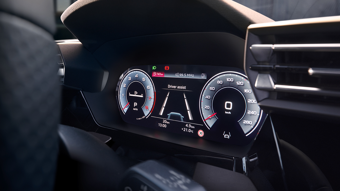 Audi A3のシャープなデザインのインテリアには、ドライバー視点に立って開発された技術が惜しみなく注ぎ込まれています。バーチャルコックピットは、メーター、地図などをフレキシブルに表示。ダッシュボードと一体化したタッチスクリーン式MMIナビゲーション*は、多彩なインフォテインメントや車両機能の制御をスマートフォン画面のように直感的にコントロールできます。
