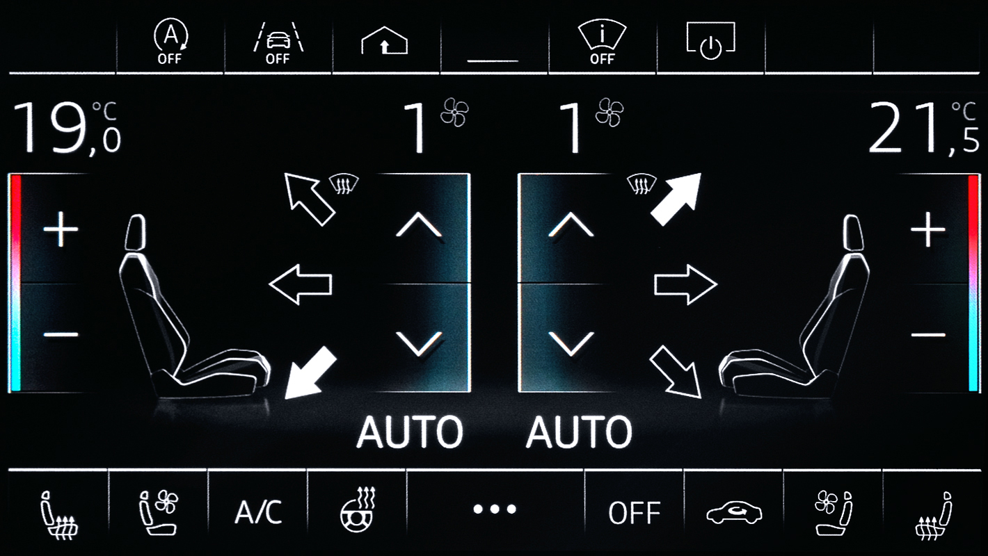 運転席、助手席、後部座席の左右それぞれで室温と風量を調節でき、快適な室内空間をもたらします。フロントではMMIナビゲーションのローワースクリーンを指でなぞるようにして左右それぞれの温度設定が可能。後部座席はタッチ式A/Cコントロールパネルを装備。乗員認識機能により効率的な温度ゾーンを調節。
