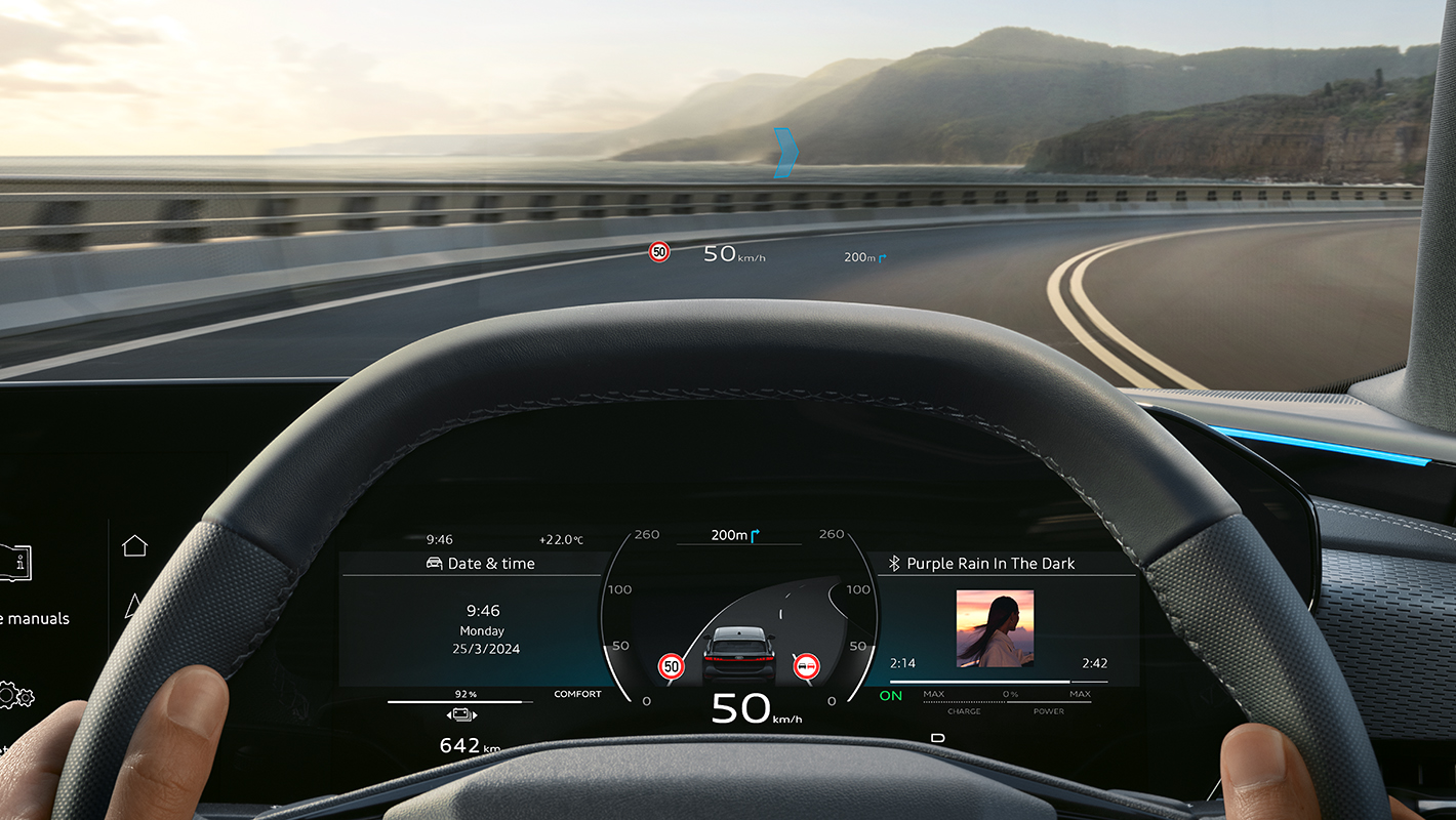 先進のデジタルステージがドライバーとパッセンジャー、乗る人すべてのデジタル体験を革新します。立体的にデザインされたダッシュボードには、美しく先進的なMMIパノラマディスプレイが統合され快適な操作環境を実現。助手席側のMMIパッセンジャーディスプレイ*は映像の視聴や充電ステーションの検索などが可能です。またバーチャルエクステリアミラー*のOLEDディスプレイは上質なインテリアに美しくなじみながら、目線の高さを考慮した見やすい位置に設置され、自然な視線移動で後方をクリアに確認することができ電動格納も可能です。