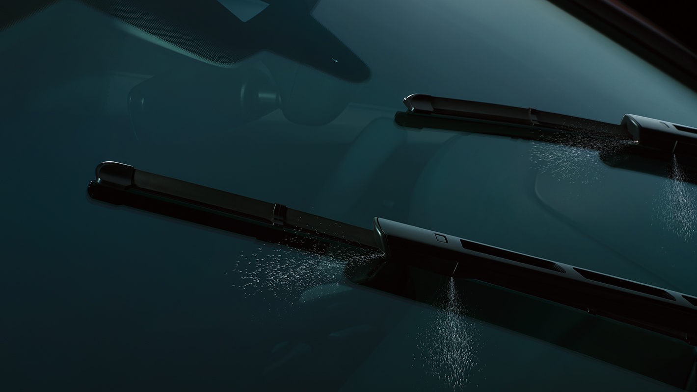ヒーター付ウォッシャージェットがワイパーブレードの上下に組みこまれています。ワイパーが上に向かって作動する際はウォッシャー液が上へ、下に向かう際は下へ噴射されます。
