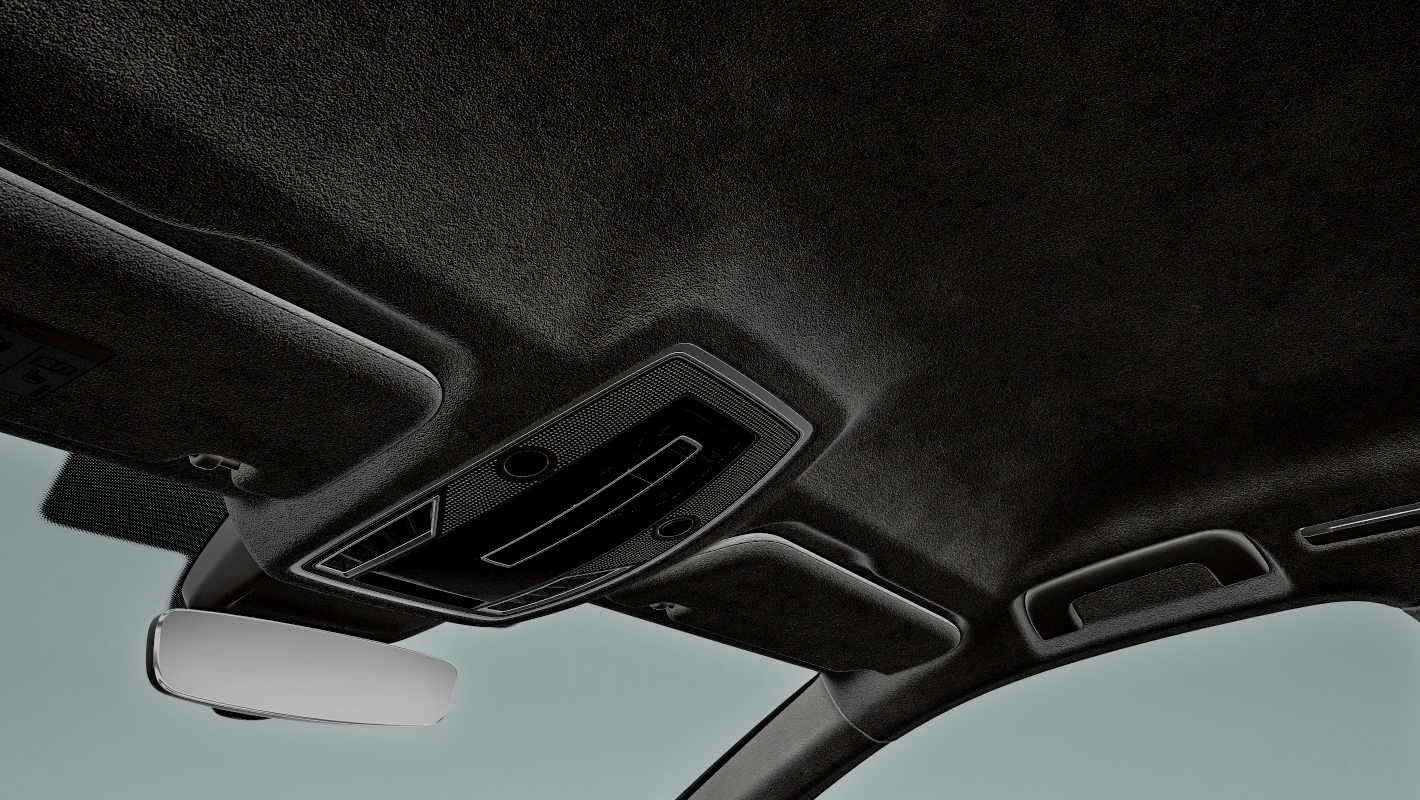 リサイクルポリエステルを用いて作られるスエード調人工皮革を使ったブラックのヘッドライニング。