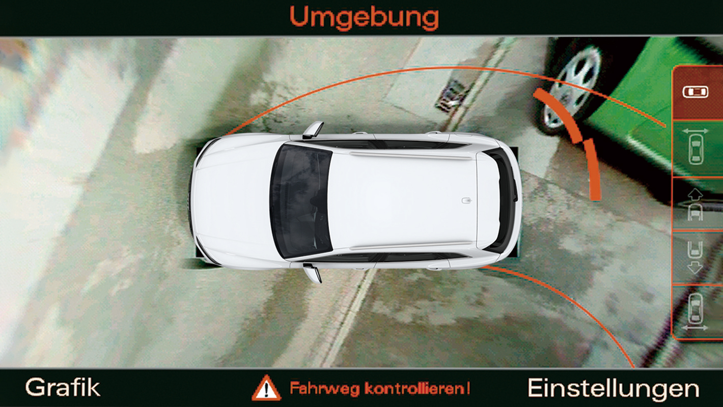 車両周囲の情報を聴覚と視覚で確認でき、駐車時の操作をサポートするシステムです。バンパーに内蔵された超音波センサーが感知した物体までの距離をMMIタッチディスプレイに表示。また、ステアリングの角度から最適な経路を事前に算出したガイドラインも表示されます。リバースギアを選択すると起動します。