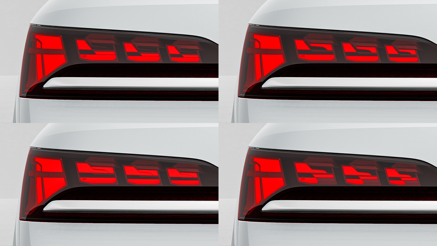 革新的なOLED (有機ELテクノロジー)によって、省電力で軽量、基板そのものが面全体で発光し、均一な照明、高い視認性そして斬新なライティングデザインを生み出します。微細な3次元のセグメントに分割できるOLEDにより、特徴的な発光パターンが可能になりました。MMIタッチディスプレイで4つの点灯パターンを切り替え可能。停車時に後続車が2m以内に近づくとすべてのOLEDセグメントを点灯させることで車間距離の確保を警告します。