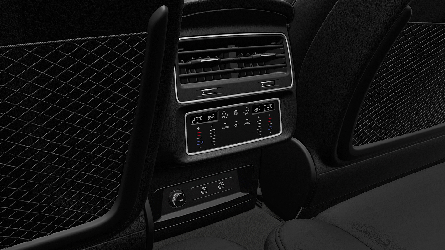 運転席/助手席の座面と背もたれに3段階で調整可能なベンチレーション機能を備え、外気温の高い時でも空気を取り入れて快適なシート環境を提供します。マッサージ機能は10個の空気圧調整式クッションで3段階の強度を選べます。シートのクイック選択ボタンまたはMMIディスプレイから操作でき、8種類のマッサージプログラムから選択することができます。
