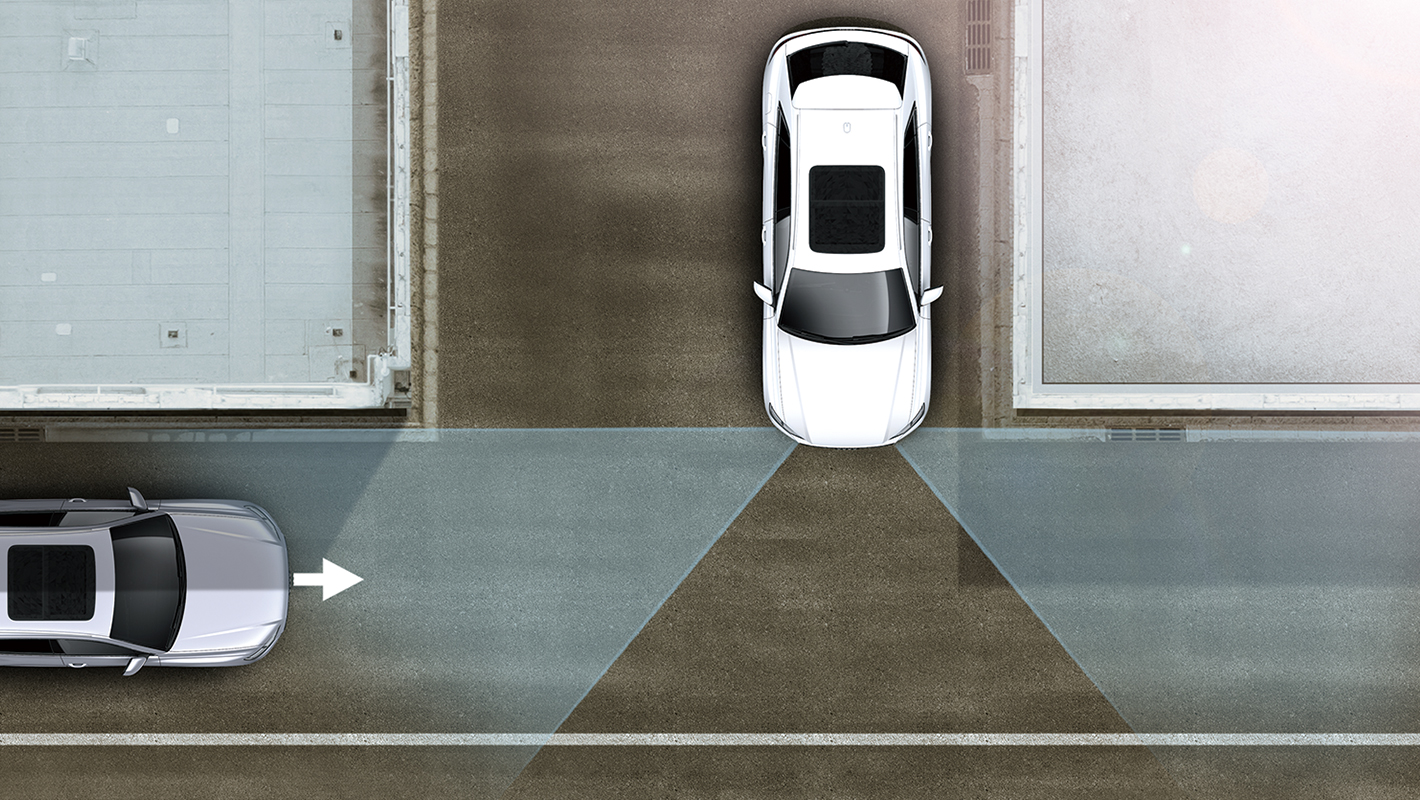 対向車および、その背後に隠れた対向車をレーダーが監視します。システムが危険を感知した場合、警告をしブレーキを自動的に作動します。