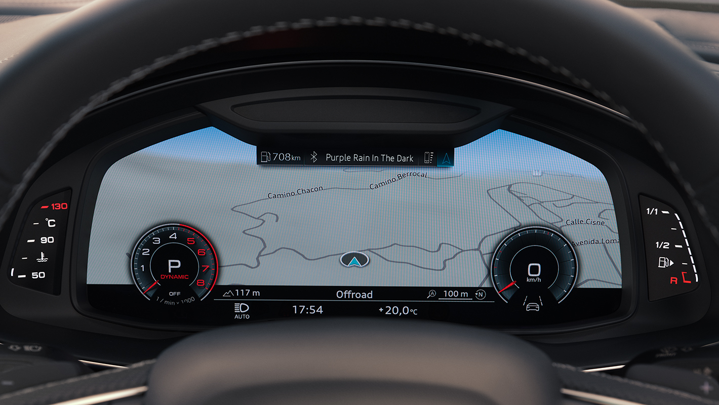 高解像度12.3インチカラー液晶フルデジタルディスプレイに、スピードメーター、タコメーター、マップ、ラジオ/メディア情報などをフレキシブルに表示。操作はマルチファンクション付きステアリングホイールからダイレクトに行えます。またVIEWボタンを押すことで2つの円形メーターの大小切り替えも可能。メーター表示を小さくすれば、オンボードコンピューターやMMIナビゲーションのコンテンツ、 3D地形図などをより見やすく画面の広いエリアに表示できます。