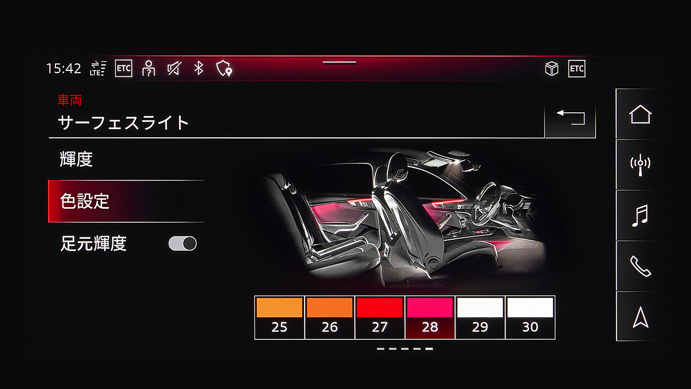 お好みのカラーの中から選び、車内を自分好みに彩ることができます。アウディドライブセレクトのそれぞれのモードに合わせたカラーも設定できます。