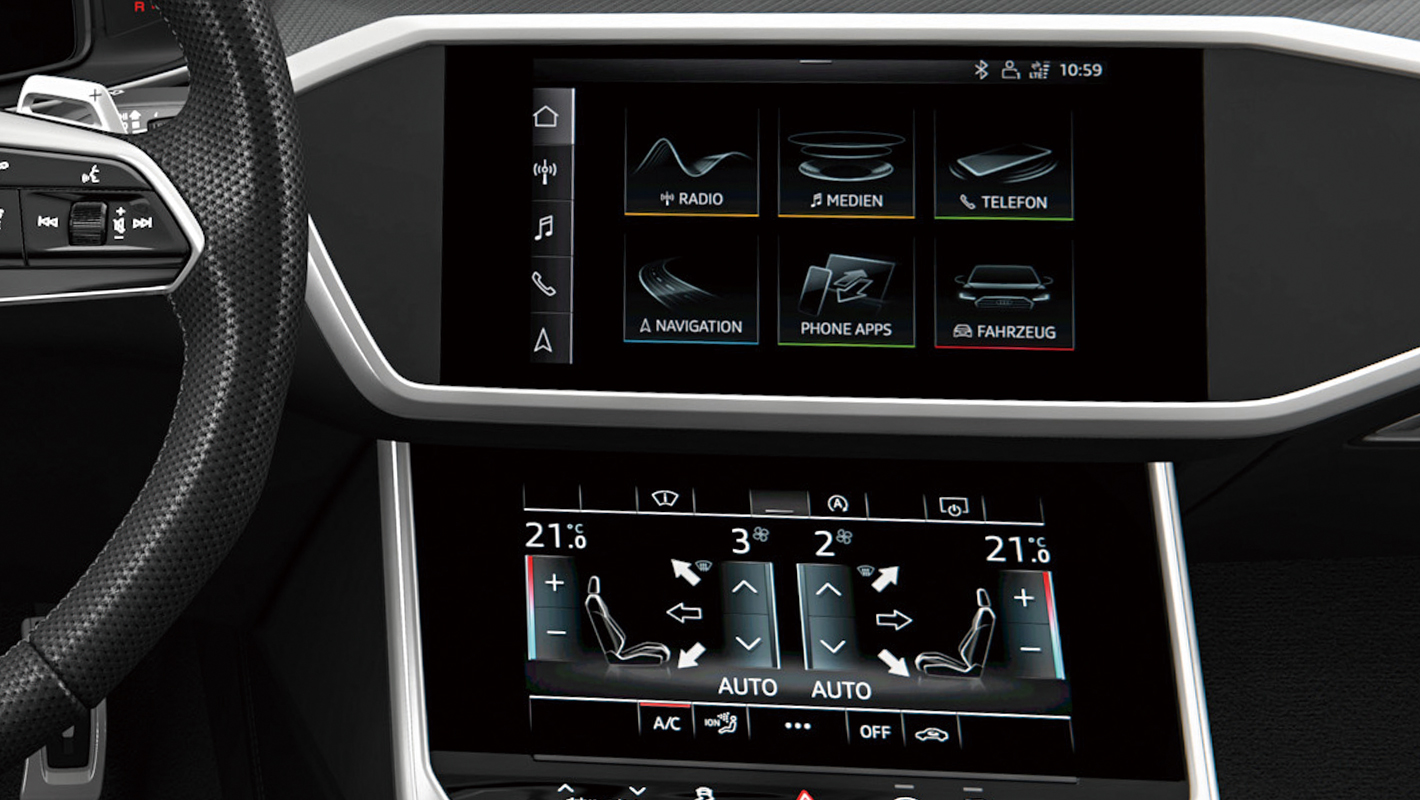 デジタル時代にふさわしいユーザーインターフェースであるMMIタッチレスポンスは、フラットな高解像度モニターで車両のセッティングやインフォテインメントを直感的に操作することが可能。グラフィックや振動、音によって、視覚、触覚、聴覚に明確な反応を感じ取れます。インフォテインメント用の10.1インチアッパースクリーンと、空調操作や手書き文字入力用の8.6インチローワースクリーンの2つのタッチディスプレイを搭載。イグニッションをOFFにするとスクリーンが漆黒のフラットなブラックパネルとなり、周囲のインテリアに溶け込みます。