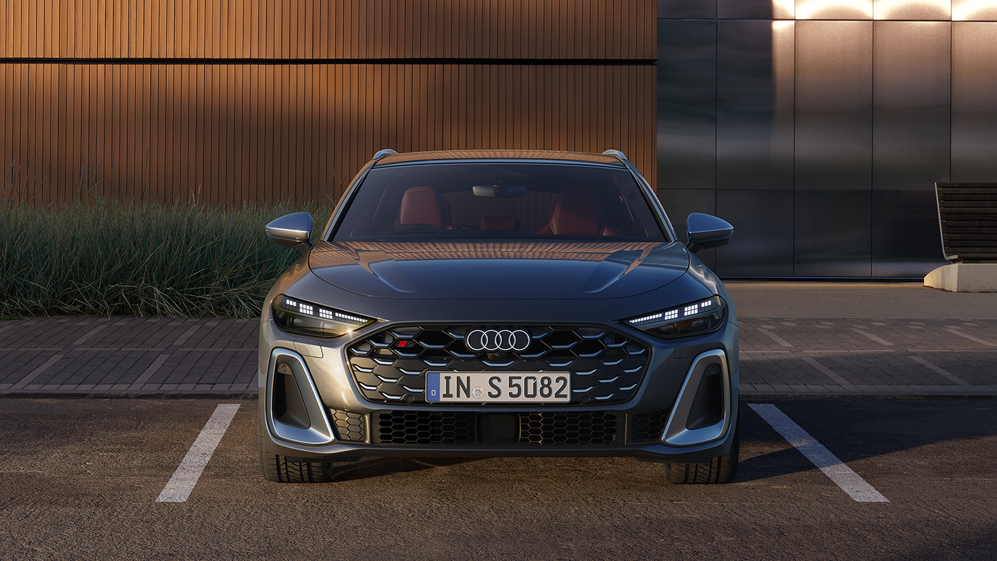Audi S5の顔となるシングルフレームグリルは、マットチタンブラックで仕上げられた大きなハニカムメッシュにL字型のインサートを採用。バンパーの両側にはマットシルバーでコントラストが付けられた幅広く大型のエアインテークを備え、Audi S5ならではのダイナミズムを加速。シャープで精密に描かれたヘッドライトと相まって、印象的な表情を作り上げています。