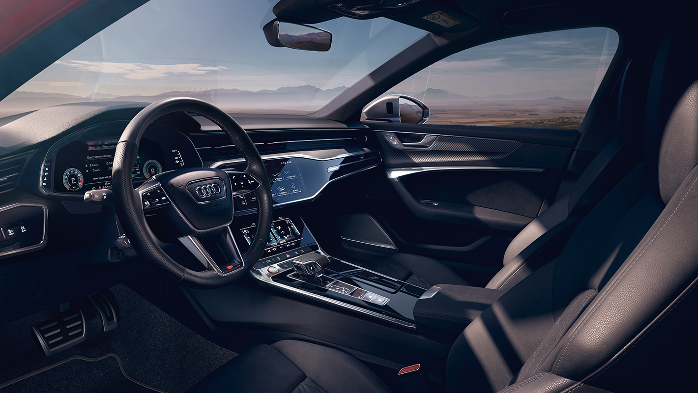 のびやかに広がるゆったりとした空間を備えるAudi S6 / S6 Avant。ブラックを基調としたインテリアはマットブラッシュトアルミニウムのデコラティブパネルや、バルコナレザーのSスポーツシートがスポーツマインドを刺激します。さらに先進のユーザーインターフェースも充実。MMIタッチレスポンスを配したセンタークラスターは、運転席側に傾けられドライバーを囲むようにレイアウト。シンプルかつ端正な美しいデザインでありつつ革新的なテクノロジーを搭載した、ドライバーオリエンテッドな空間に仕立てられています。