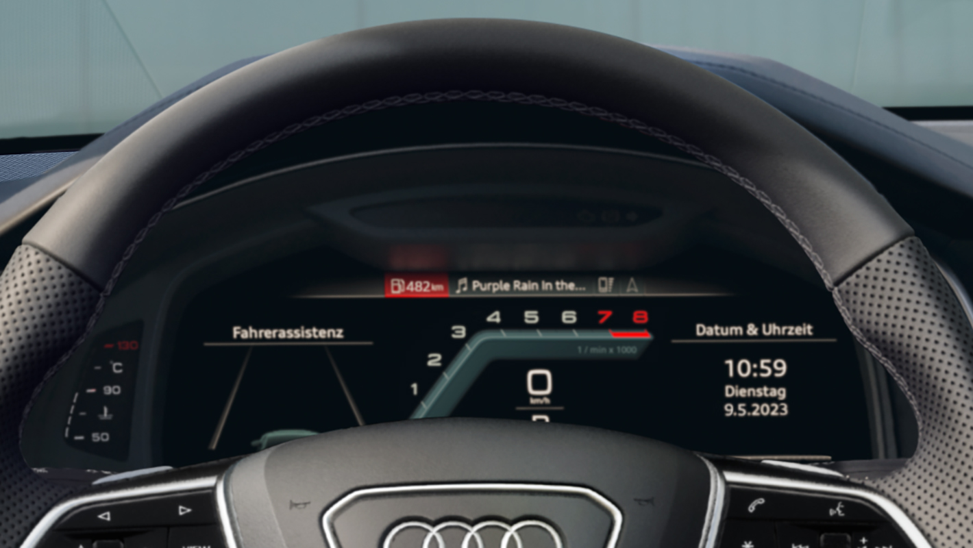 高解像度12.3インチカラー液晶フルデジタルディスプレイに、スピードメーター、タコメーター、マップ表示、ラジオ/メディア情報などフレキシブルに表示。操作もマルチファンクション付きステアリングホイールからダイレクトに行えます。またVIEWボタンを押すことで2つの円形メーターの大小切り替えも可能。メーター表示を小さくすれば、オンボードコンピューターやMMIナビゲーションのコンテンツ、3D地形図などをより見やすく画面の広いエリアに表示できます。ルートガイダンスを起動している間は、スピードメーター近くにナビゲーション情報が常時表示され、タコメーターにオンボードコンピューター数値の配置も可能です。