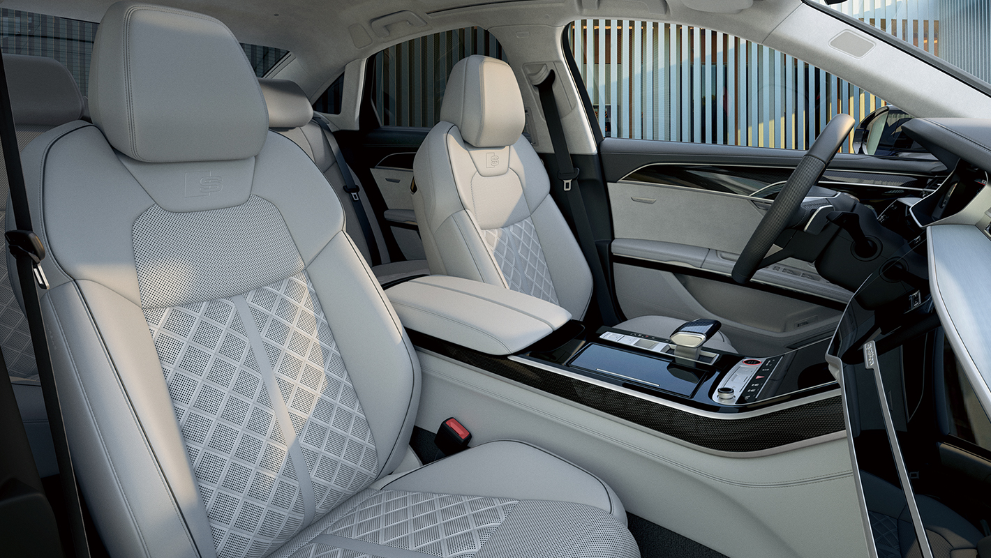 Audi S8のインテリアにはエレガンスと走りへの情熱が見事に調和。標準装備のフルレザーパッケージの優美な質感に加え、Sロゴが刻まれたコンフォートスポーツシート、デコラティブパネルやセレクターレバーなど各所に配されたカーボンが躍動するスポーティネスを演出します。