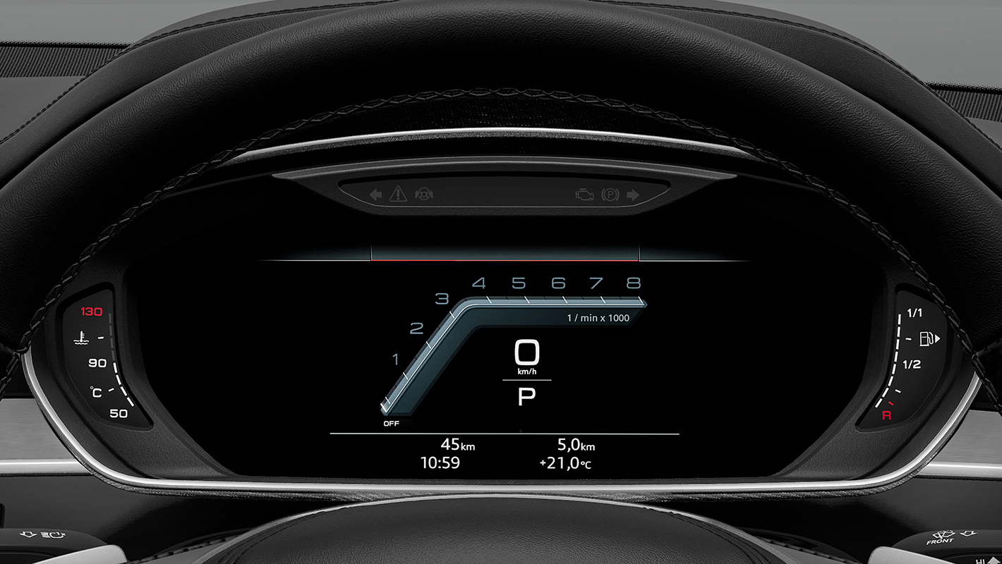 高解像度12.3インチカラー液晶フルデジタルディスプレイに、スピードメーター、タコメーター、マップ表示、ラジオ/メディア情報などフレキシブルに表示。操作はマルチファンクション付きステアリングホイールからダイレクトに行えます。レイアウトは「ダイナミック」、「スポーツ」、「Sパフォーマンス」から選択できます。またVIEWボタンを押すことでメーターの大小切り替えも可能。メーター表示を小さくすれば、オンボードコンピューターやMMIナビゲーションのコンテンツ、3D地形図などをより見やすく画面の広いエリアに表示できます。ルートガイダンスを起動している間は、スピードメーター近くにナビゲーション情報が常時表示され、タコメーターにオンボードコンピューター数値の配置も可能です。