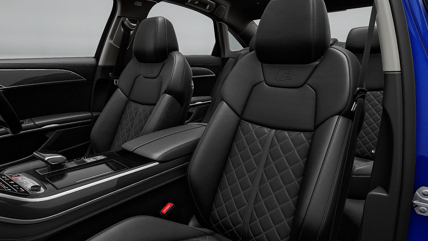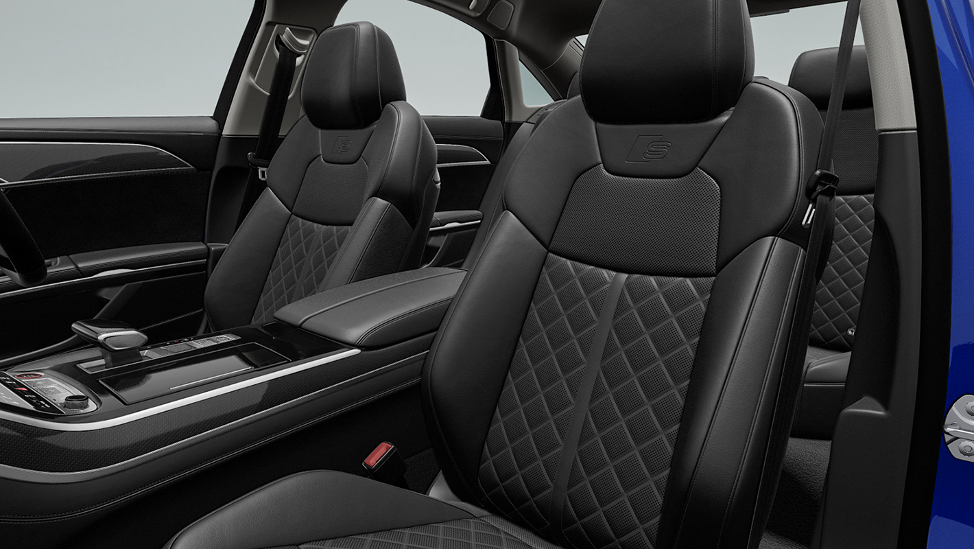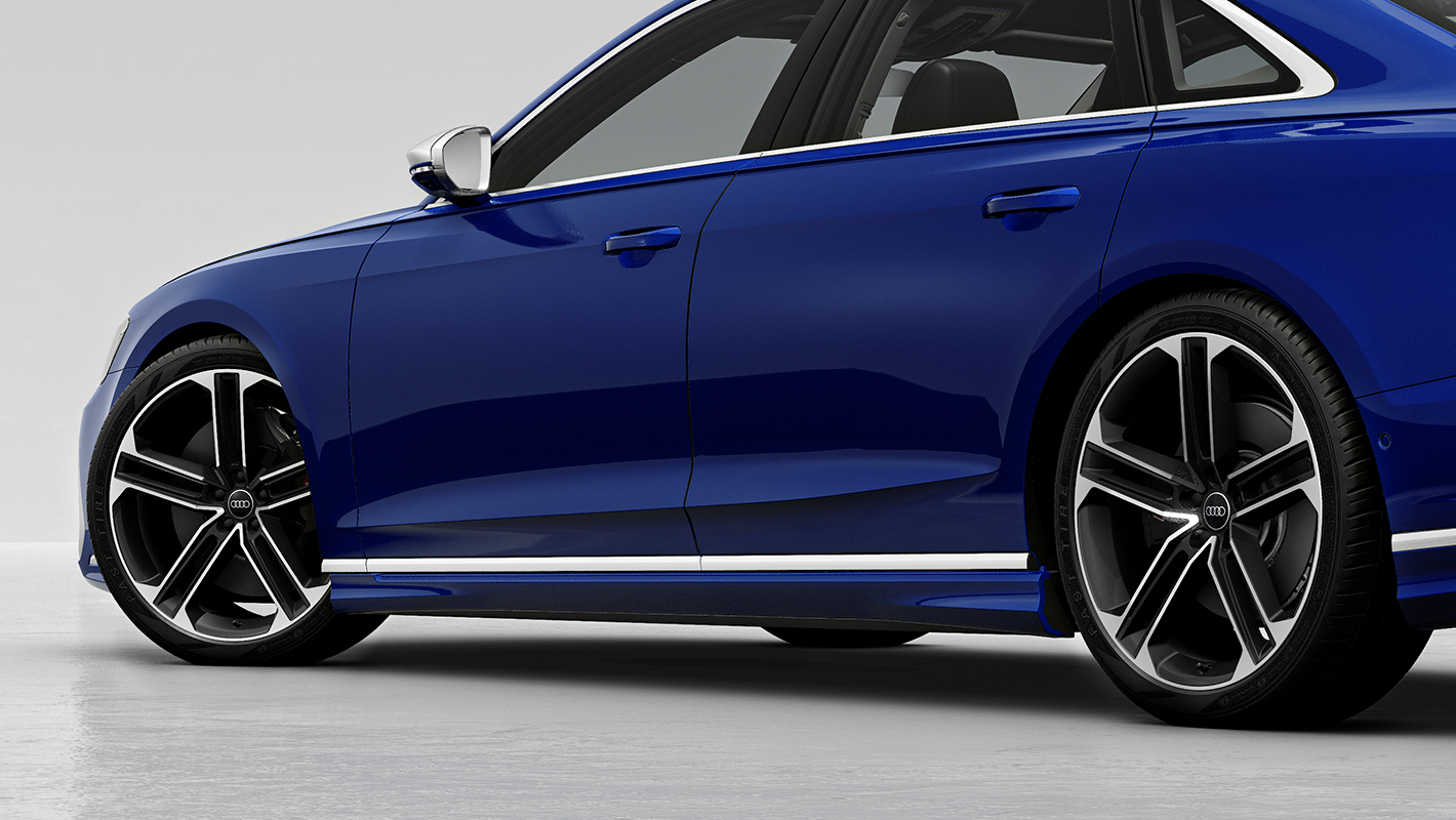 フラッグシップモデルにふさわしい洗練された姿と、Sモデル専用デザインが融合。アルミニウムルックインサートを備えたハニカムメッシュデザインのシングルフレームグリル、力強い印象の前後バンパー、4本出しのテールパイプがパフォーマンスの高さを表現。アルミニウムルックのエクステリアミラーハウジング、大径21インチのアルミホイールが精悍さを演出。Audi S8の造形は、プレステージサルーンとしての品格と常識を超越するパフォーマンスへの自信に満ちています。