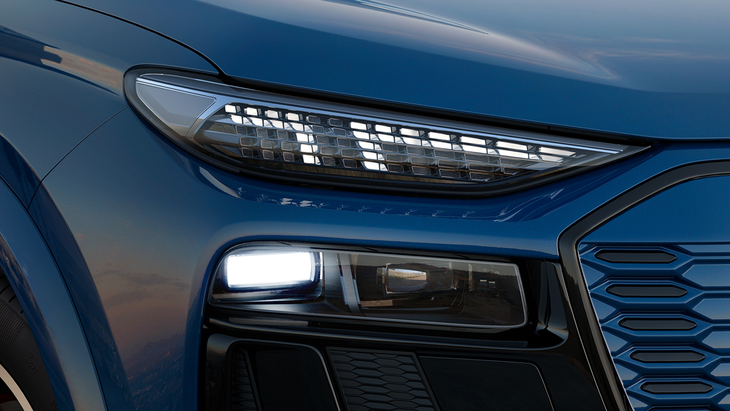 圧倒的な存在感を放つAudi SQ6 e-tronのフロントフェイス。フラットなデザインのデジタルデイタイムランニングライトとマトリクスLEDヘッドライトがシャープな表情を描きます。ボディ同色のシングルフレームグリルはアルミルックインサートを採用。グリルを囲むマットクロームシルバー仕上げの大型エアインテークがSモデルのアグレッシブなスタイルを強調。ダークAudi rings&ブラックスタイリングパッケージ*を選択すれば、随所にブラックのアクセントが施され、さらに精悍なスタイルに。