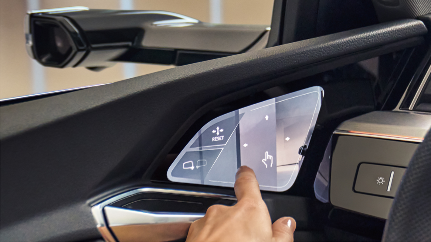 従来のエクステリアミラーの代わりに小型カメラシステムを搭載。後方の様子は車内のOLEDタッチディスプレイに映し出されます。従来のミラーに比べて空気抵抗と風切り音を低減するとともに、雨や雪などの悪天候時や夕暮れ時にも周囲を鮮明な映像で確認できます。視界の位置や角度は近接センサー付きタッチディスプレイに触れることで調整可能。駐車時、右左折時、高速走行時など、様々なシーンで高い視認性を提供します。