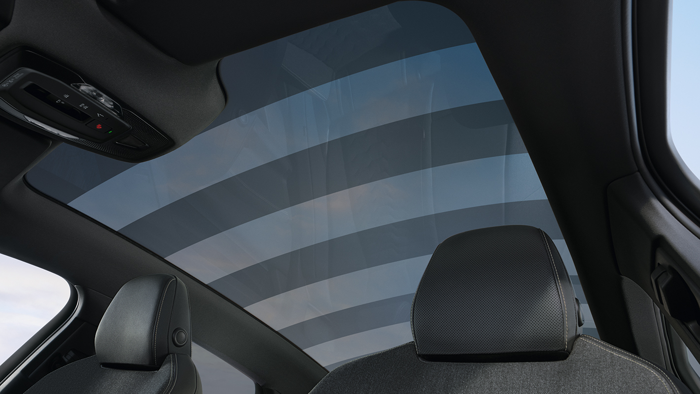 天井全体に広がるスマートパノラマガラスルーフ*は、透明度を変更できるPDLC技術 (ポリマー分散型液晶)を採用。9セグメントに分けて遮光モードの切り替えができます。熱線を低減する構造により、快適性を保ちながら車内の隅々に自然光を豊かに採り込めます。システムを停止すると自動で不透明に切り替わり、再びシステムを始動すると最後に選択した設定になります。