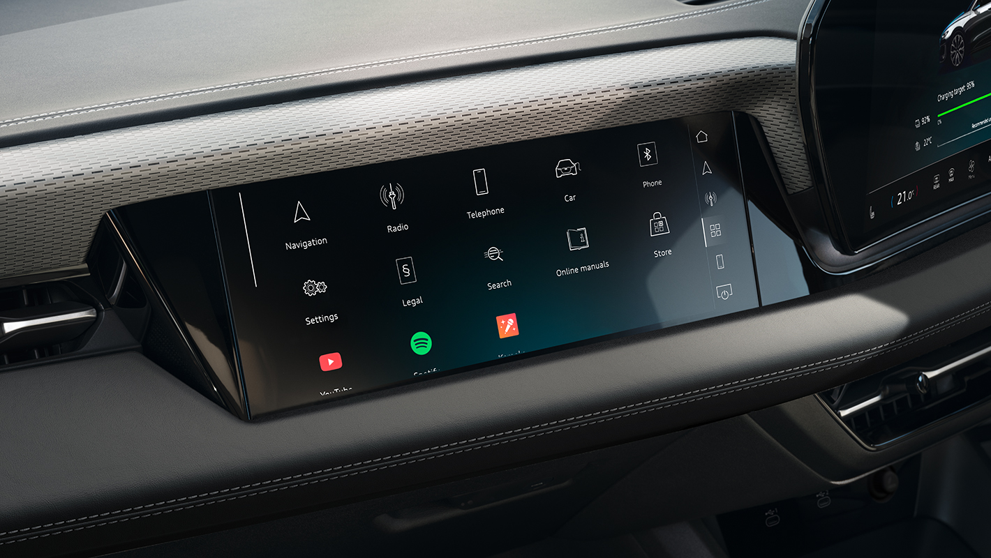 先進のデジタルステージがドライバーとパッセンジャー、乗る人すべてのデジタル体験を革新します。立体的にデザインされたダッシュボードには、美しく先進的なMMIパノラマディスプレイが統合され快適な操作環境を実現。助手席側のMMIパッセンジャーディスプレイ*は映像の視聴や充電ステーションの検索などが可能です。またバーチャルエクステリアミラー*のOLEDディスプレイは上質なインテリアに美しくなじみながら、目線の高さを考慮した見やすい位置に設置され、自然な視線移動で後方をクリアに確認することができ電動格納も可能です。
