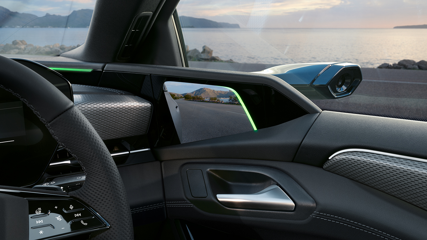 従来のエクステリアミラーの代わりに小型カメラシステムを搭載。後方の様子は車内のOLEDタッチディスプレイに映し出されます。従来のミラーに比べて空気抵抗と風切り音を低減するとともに、雨や雪などの悪天候時や夕暮れ時にも周囲を鮮明な映像で確認できます。視界の位置や角度は近接センサー付きタッチディスプレイに触れることで調整可能。駐車時、右左折時、高速走行時など、様々なシーンで高い視認性を提供します。