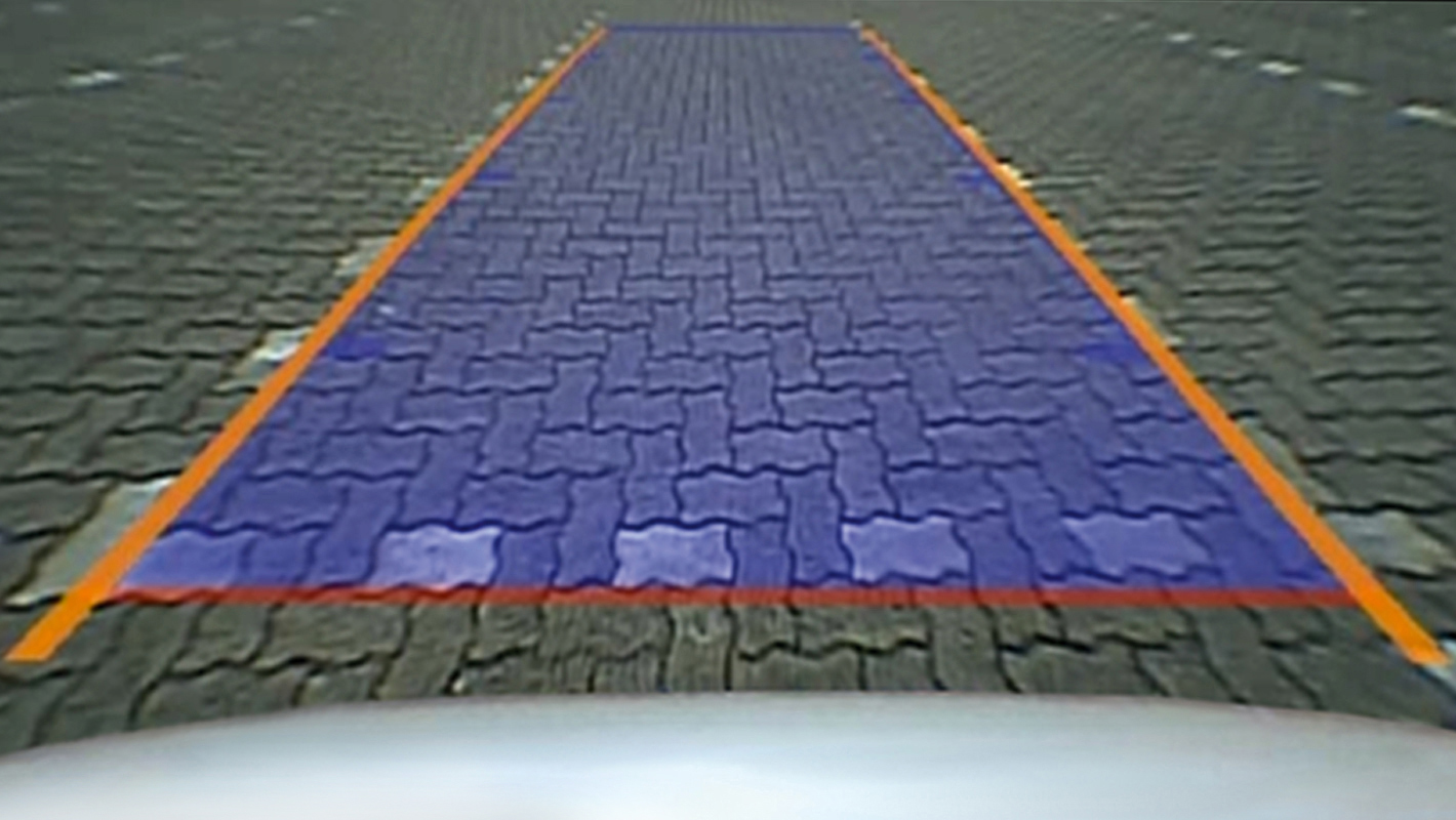 超音波センサーによりパーキングスペースを検知し、理想的な駐車経路と退出経路を算出。ドライバーはディスプレイの指示に従ってPボタンを押し続け、駐車プロセスを監視するだけでクルマをスムーズに駐車スペースへ移動することができます。操舵角に応じて経路が表示され、経路上の障害物をドライバーへディスプレイを通して速やかに警告します。