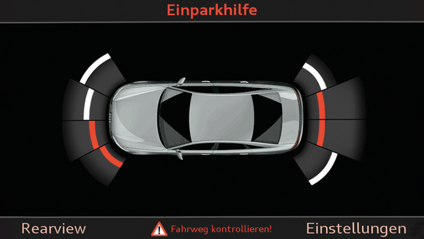 車両のフロントおよびリヤの情報を聴覚と視覚で確認でき、駐車時の操作をサポートするシステムです。バンパーに内蔵された超音波センサーが感知した情報を、MMIタッチディスプレイに表示。リバースギア、またはセンターコンソールのボタンで起動します。ステアリングの角度から最適な入車経路を事前に算出し、ディスプレイの車両横にガイドラインで表示。駐車スペースからの出入車が楽に行えます。