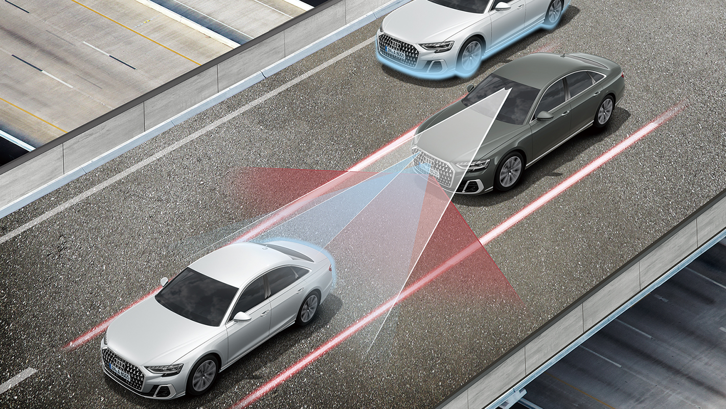 車両のリヤに設置された、レーダーセンサーが捉えたデータを利用して、後方から接近する車両を監視。追突されるリスクが検知された場合、アウディプレセンスベーシックを起動します。