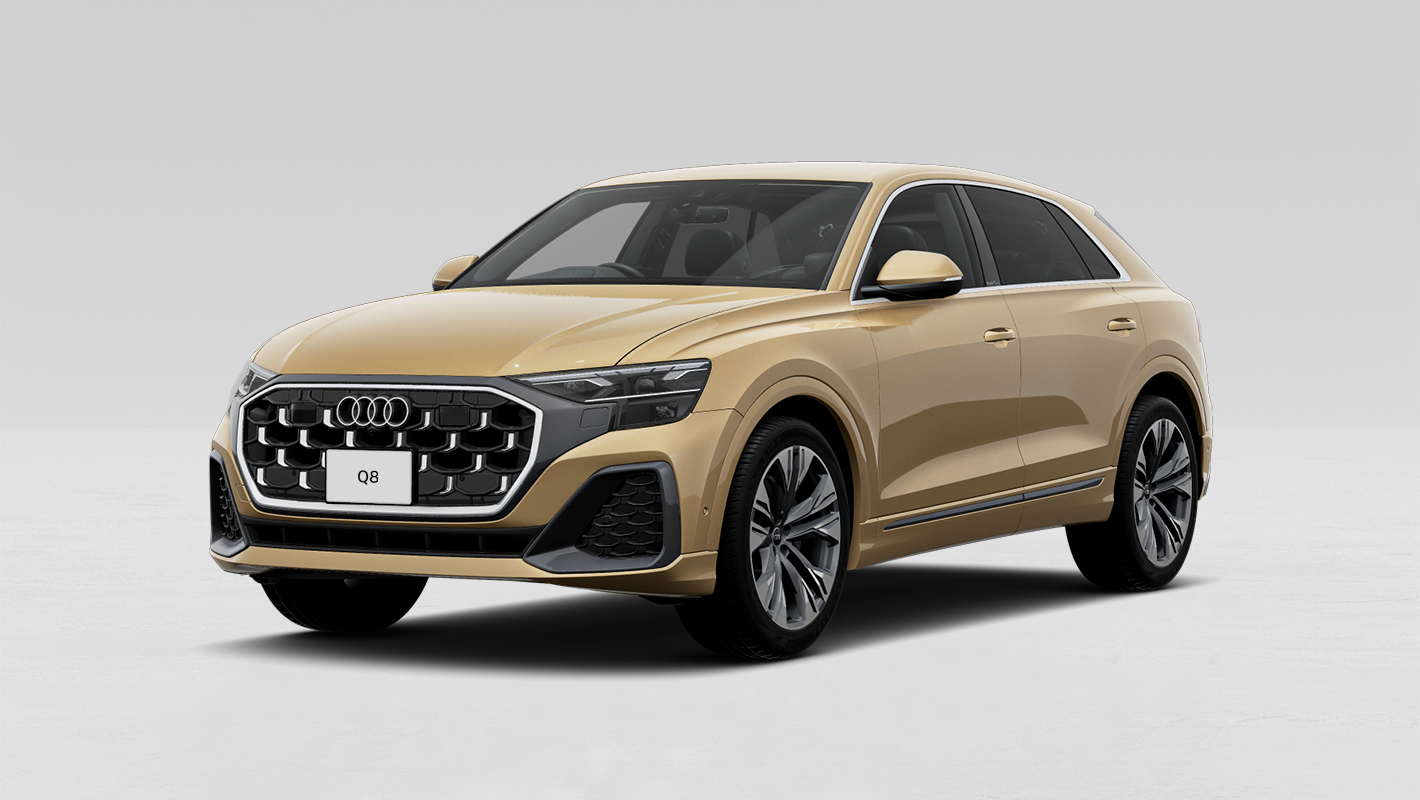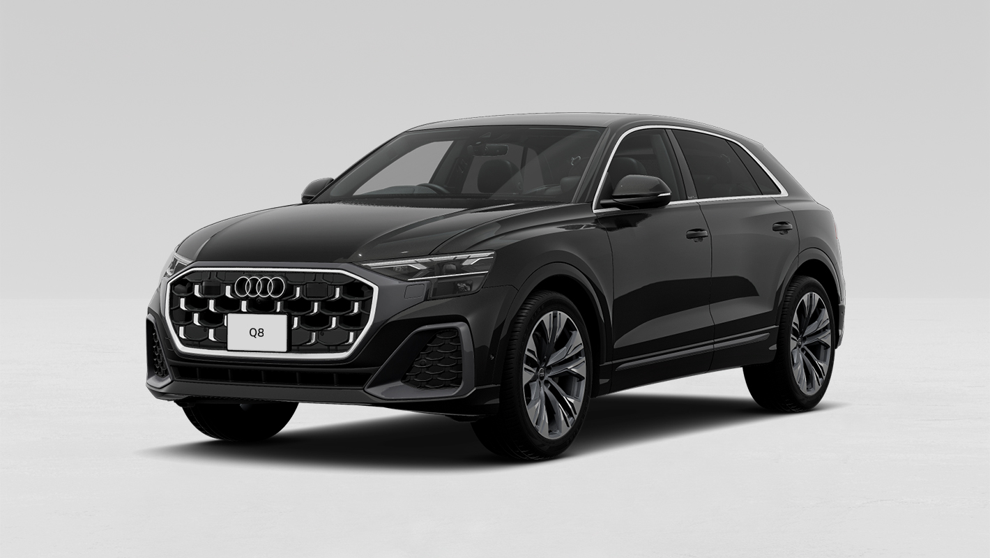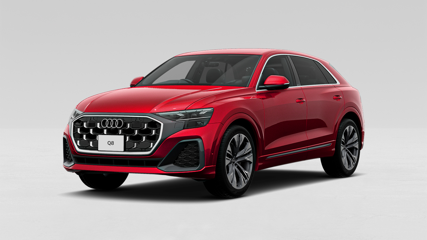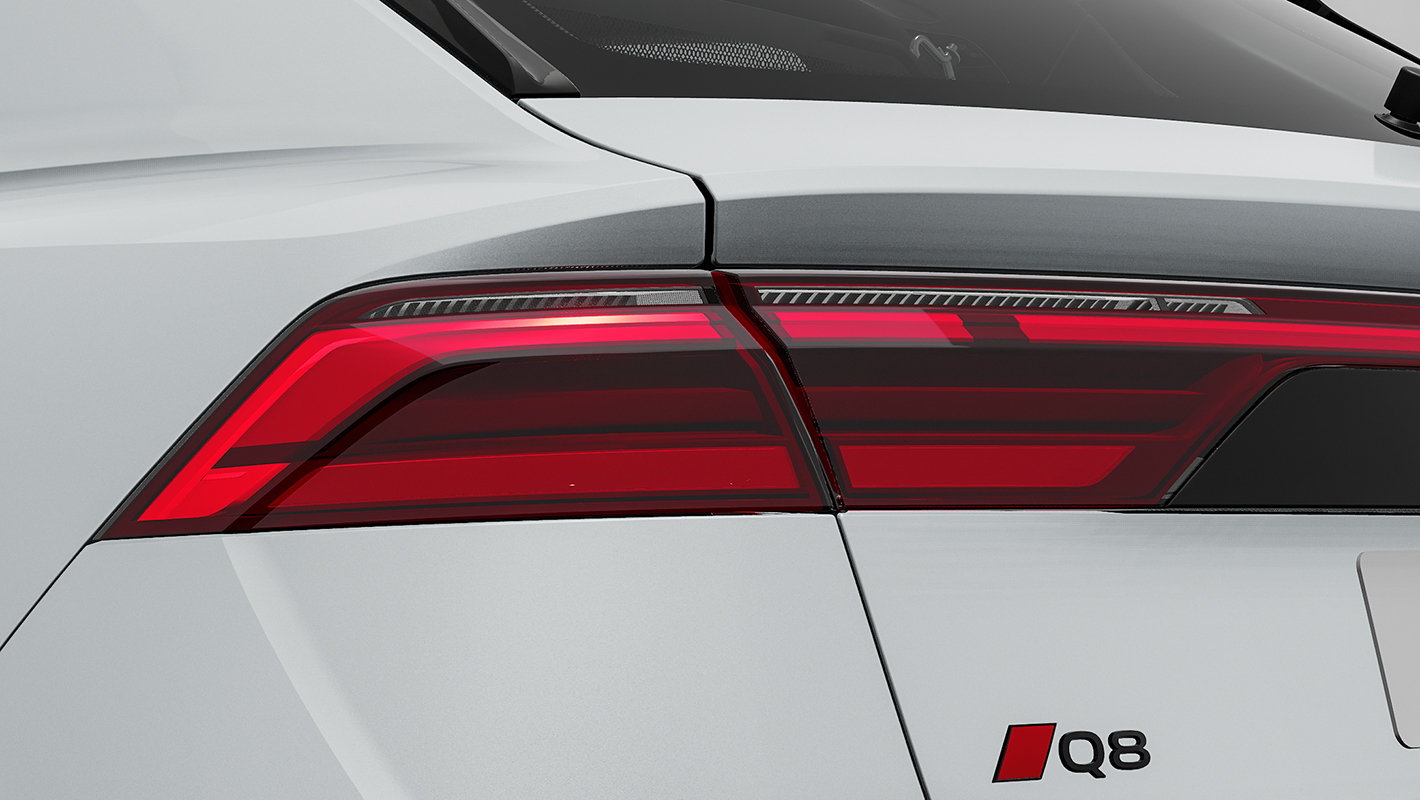 Audi Q8から、さらにスポーティな魅力をこの上なく引き出すS lineのエクステリア。グリルの周りをグレーで囲い込むことでよりワイド&ローのスタンスを強調。L字型の加飾を施したS line専用グリル。ボディ同色のS lineバンパーと大型のエアインレットが一体感を高め、スポーティネスとダイナミズムを併せ持つ印象的なフロントエンドを生み出します。