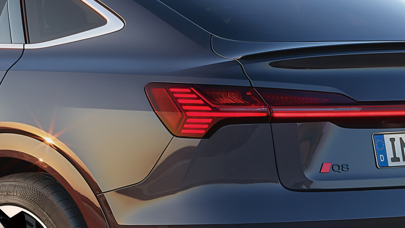 ひと目でAudiの電気自動車とわかる先進的なフロントフェイスを際立たせているのが、幅広くフラットなシングルフレームグリル。その中央には2次元でありながら立体的に浮き上がり印象的に輝くAudi ringsがレイアウトされ、周囲を取り囲むブラックのマスクが精悍な表情を作り上げています。エクステリアは各部のディテールに至るまで形状を研ぎ澄まし、エアフローを徹底的に最適化。エアロダイナミクスが磨き上げられたAudi Q8 e-tronのフォルムは、目に見える美しさのみならず、空気抵抗による損失を防ぎ、一充電走行距離の向上を両立しています。