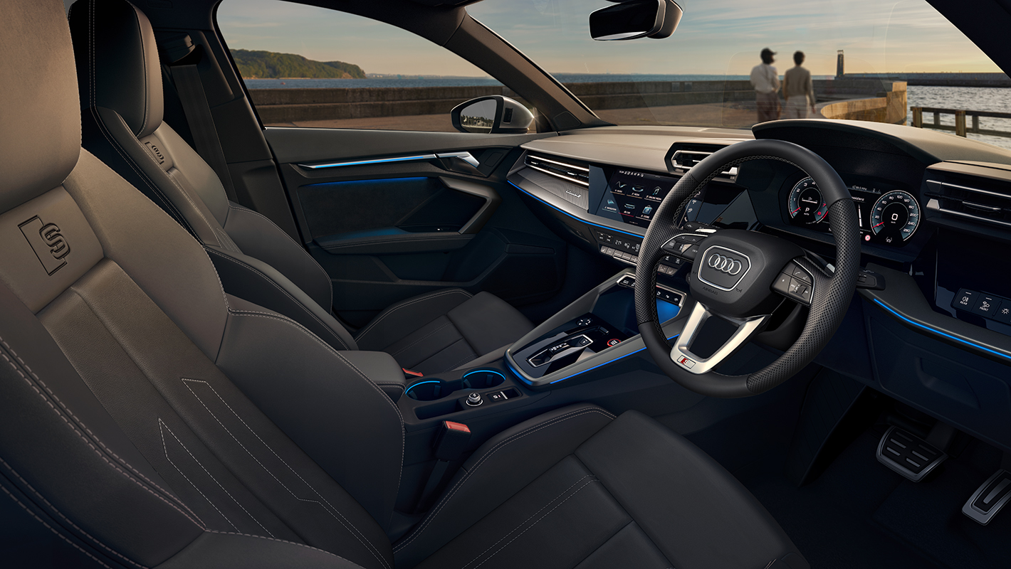 ブラック基調の空間に上質さが美しく調和するAudi S3のインテリア。レザー/アーティフィシャルレザー仕立てのスポーツシートはスポーティな走行時にも身体をしっかりとサポート。新しいデザインのシフトスイッチに、ダークアルミニウムスペクトラムのデコラティブパネル、ダッシュボードに配したコントラストステッチなど、細部にまで妥協なく磨かれたインテリアは、スポーティネスと気品をたたえるプレミアムスポーツにふさわしい内装です。