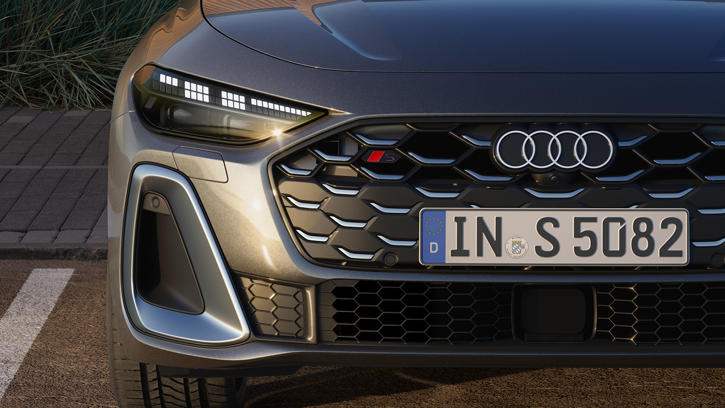 Audi S5の顔となるシングルフレームグリルは、マットチタンブラックで仕上げられた大きなハニカムメッシュにL字型のインサートを採用。バンパーの両側にはマットシルバーでコントラストが付けられた幅広く大型のエアインテークを備え、Audi S5ならではのダイナミズムを加速。シャープで精密に描かれたヘッドライトと相まって、印象的な表情を作り上げています。