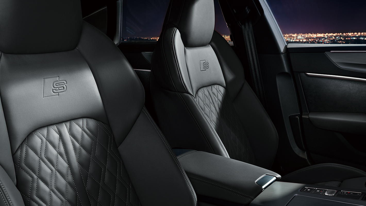 専用デザインのSスポーツバンパー、ハニカムメッシュデザインのシングルフレームグリルがシャープな表情を見せるフロントフェイス。リヤエンドでは120km/hで自動的に立ち上がる電動格納式リヤスポイラー、ブラックのリヤディフューザーとクロームのエキゾーストテールパイプが個性を主張。足回りは標準装備の20インチアルミホイールに加えて、迫力溢れる21インチアルミホイールをオプションでご用意。Audi S7 Sportbackの走りを予感させるディテールの数々が鮮烈な印象を残します。
