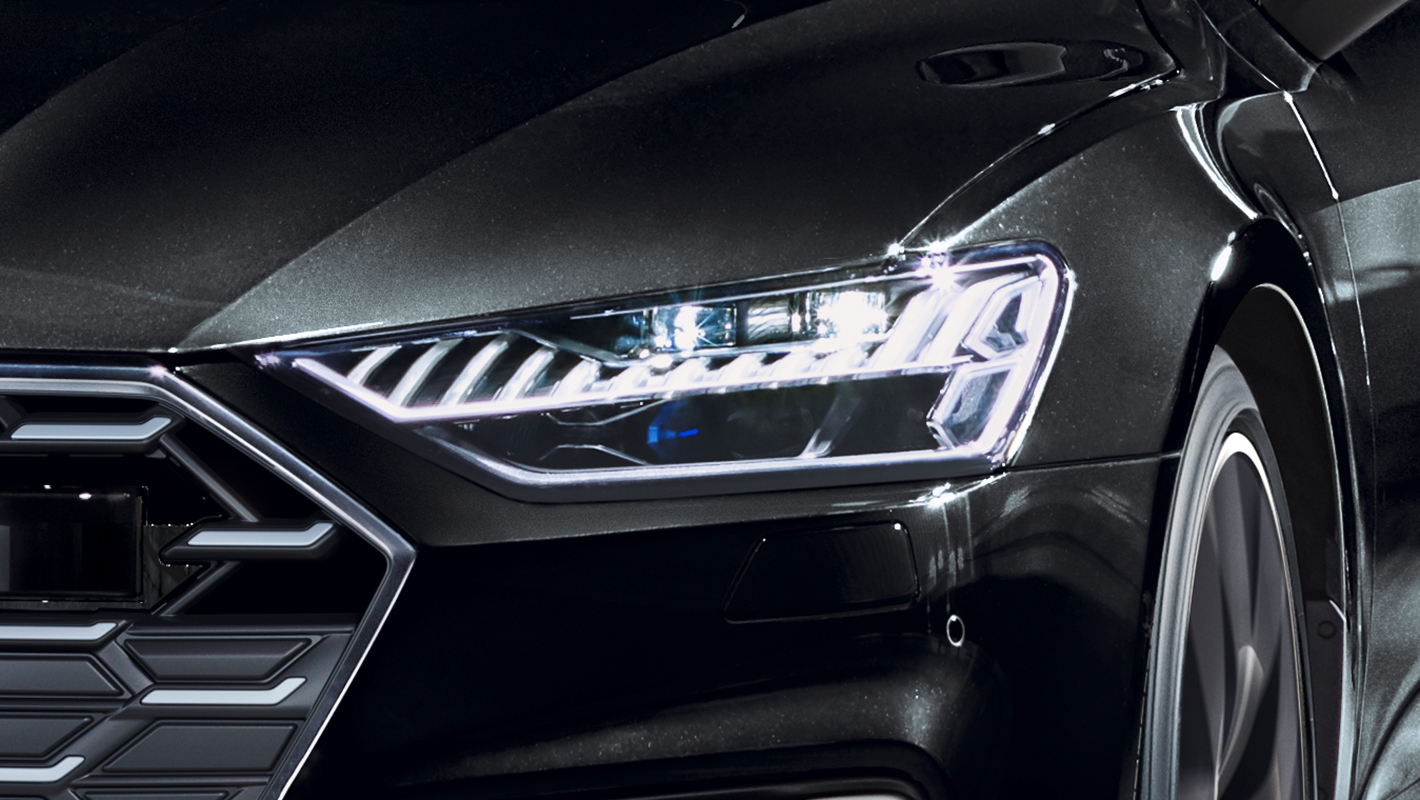 先進のライティングテクノロジーを印象的に視覚化。HDマトリクスLEDヘッドライトは、状況に合わせて配光を可変させ高度に制御。高速走行で対向車や先行車の車両を検知すると、検知された車両へ直接光を照射しないようにコントロールしつつ、それ以外の車間エリアや周辺は明るく照らし続けます。アウディレーザーライトはハイビームの照射距離を約2倍に拡大。シャープな眼差しがフロントフェイスに精悍さを与えます。