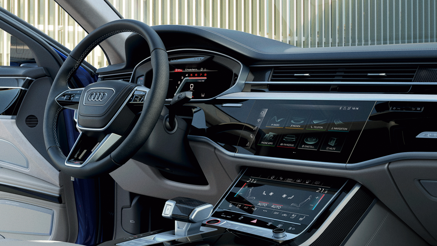 高解像度液晶ディスプレイにメーターや地図などを表示するバーチャルコックピットプラスやMMIタッチレスポンスをはじめ直感的な操作を叶えるインテリジェントに進化したデジタルテクノロジーを採用。2つのタッチディスプレイにインフォテインメントや便利な機能を表示するMMIタッチレスポンスは、ボタンやスイッチのないフラットなデザインで、画面をオフにするとブラックのフラットなパネルとなり、インテリアに溶け込むようデザインされています。