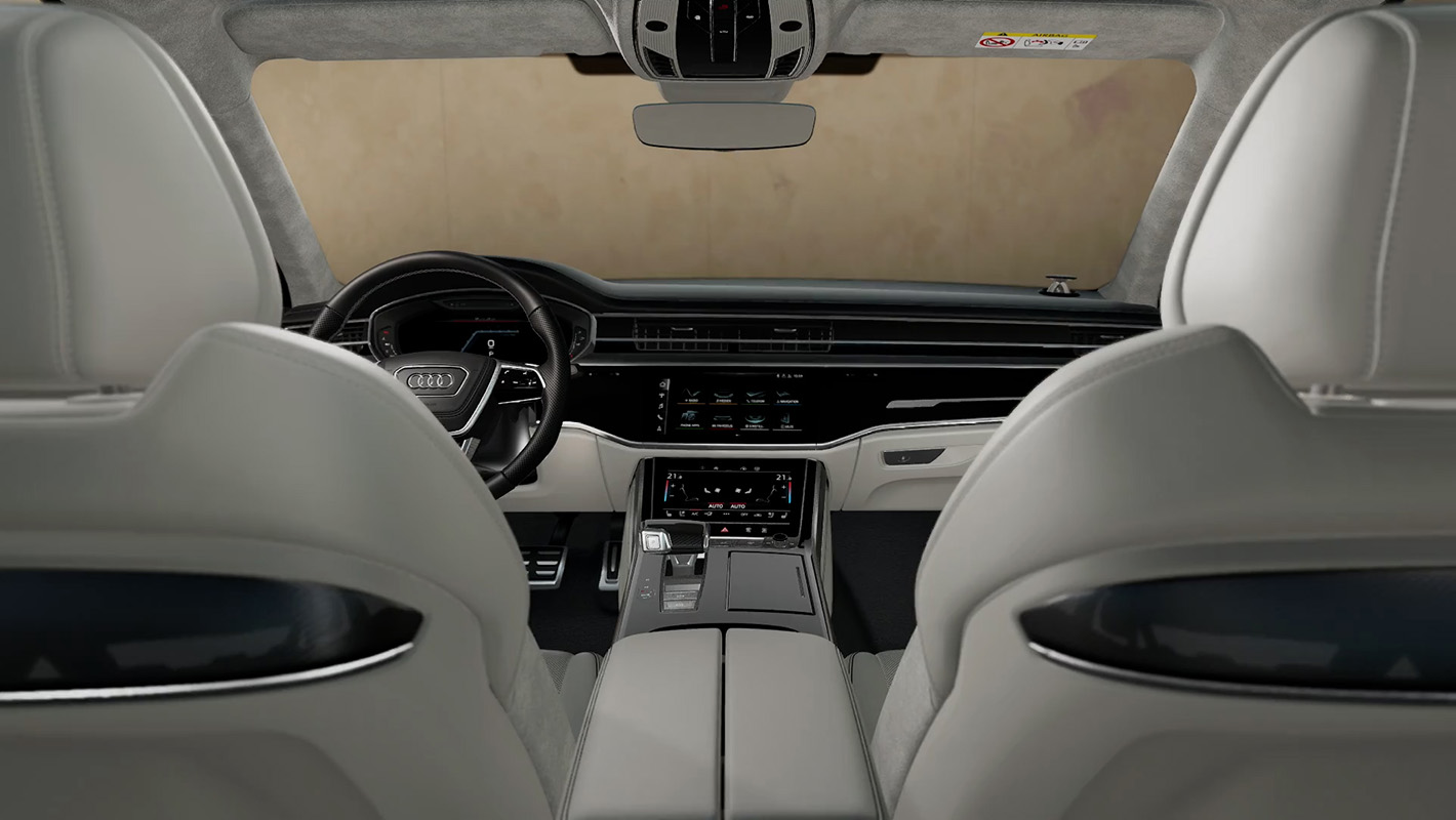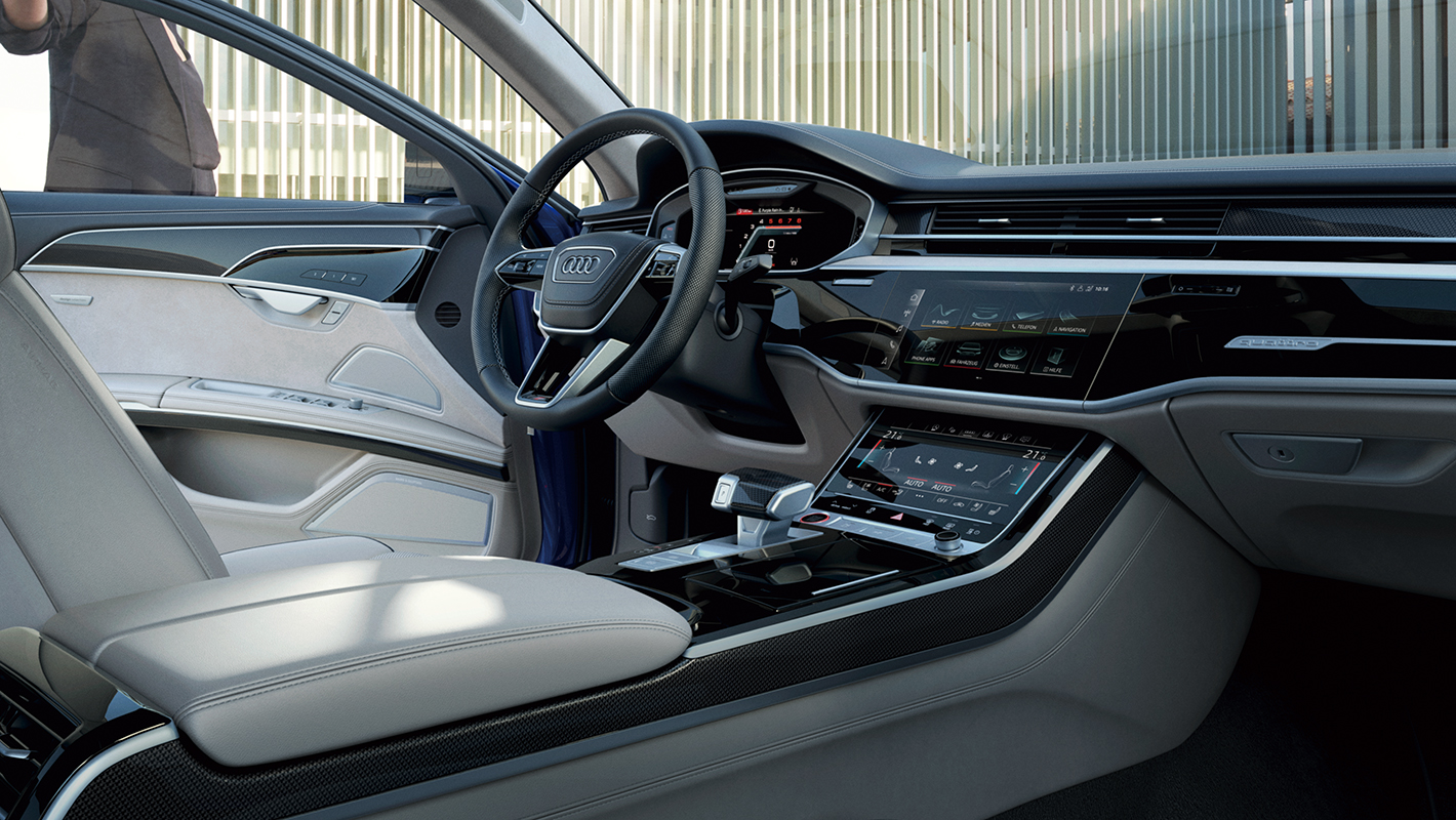 Audi S8のインテリアにはエレガンスと走りへの情熱が見事に調和。標準装備のフルレザーパッケージの優美な質感に加え、Sロゴが刻まれたコンフォートスポーツシート、デコラティブパネルやセレクターレバーなど各所に配されたカーボンが躍動するスポーティネスを演出します。