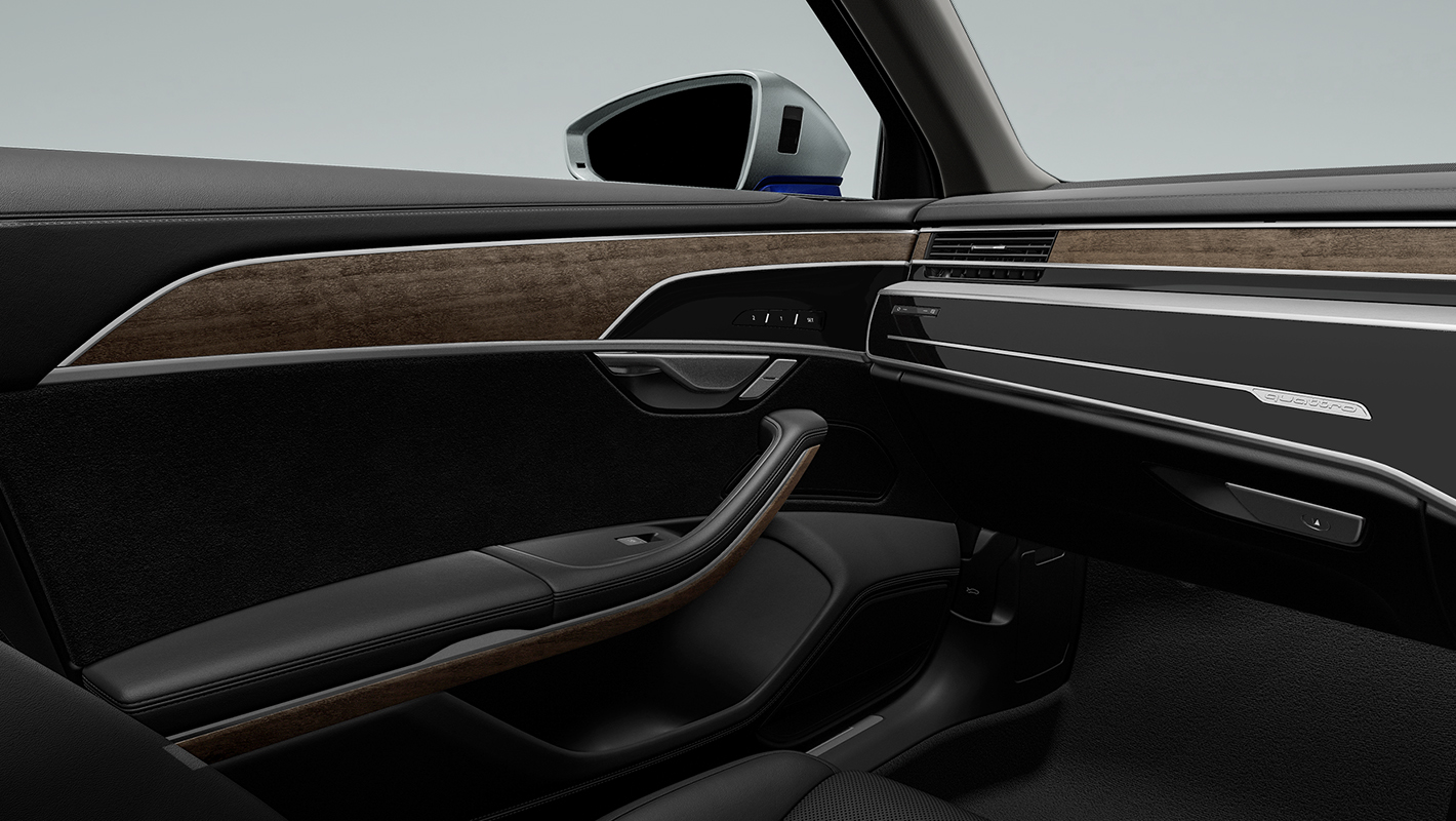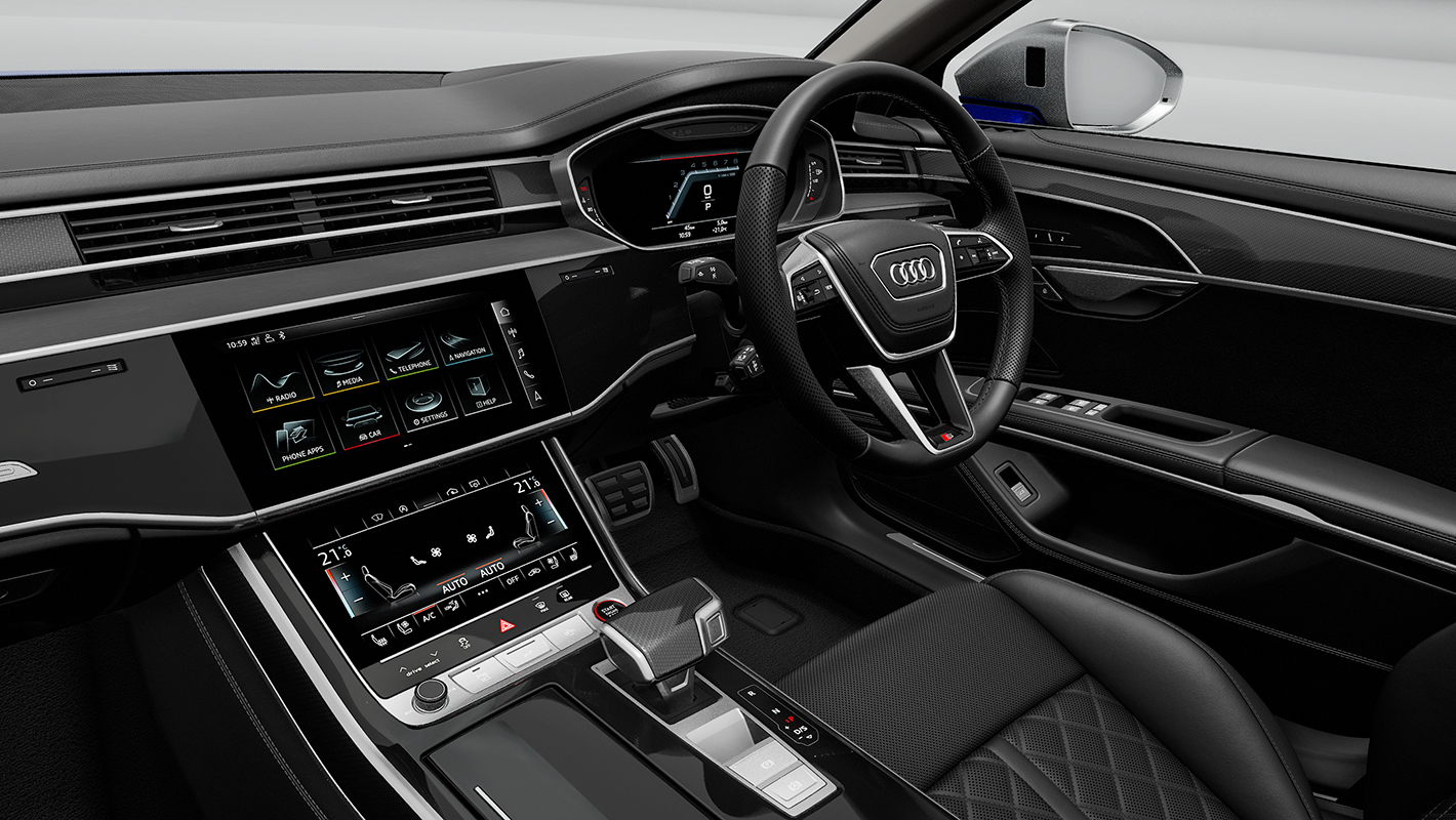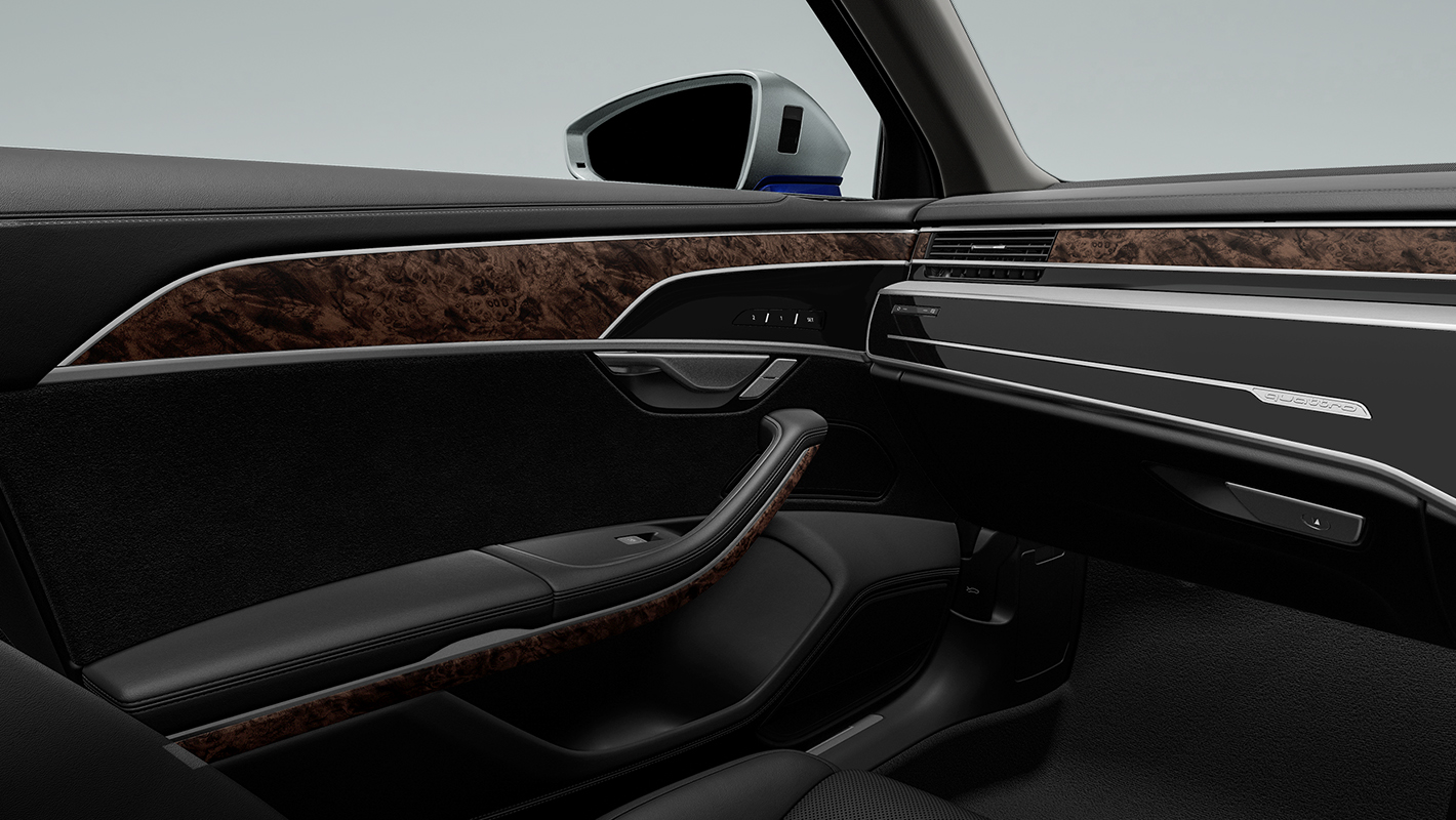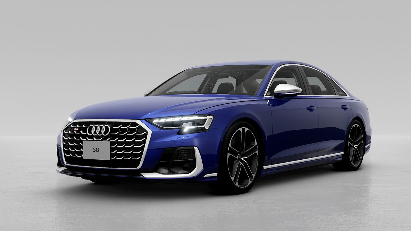 フラッグシップモデルにふさわしい洗練された姿と、Sモデル専用デザインが融合。アルミニウムルックインサートを備えたハニカムメッシュデザインのシングルフレームグリル、力強い印象の前後バンパー、4本出しのテールパイプがパフォーマンスの高さを表現。アルミニウムルックのエクステリアミラーハウジング、大径21インチのアルミホイールが精悍さを演出。Audi S8の造形は、プレステージサルーンとしての品格と常識を超越するパフォーマンスへの自信に満ちています。
