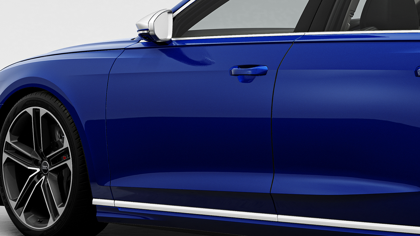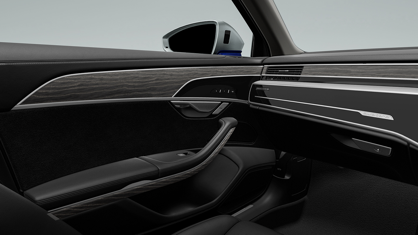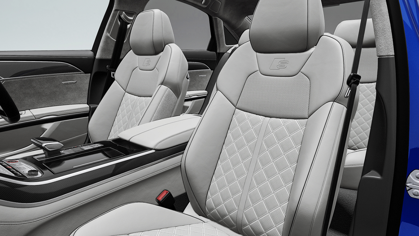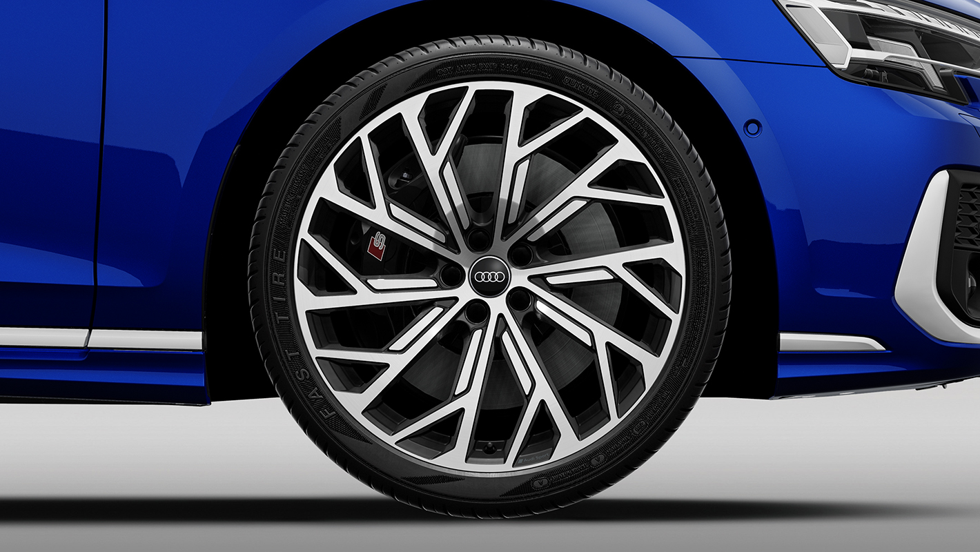 フラッグシップモデルにふさわしい洗練された姿と、Sモデル専用デザインが融合。アルミニウムルックインサートを備えたハニカムメッシュデザインのシングルフレームグリル、力強い印象の前後バンパー、4本出しのテールパイプがパフォーマンスの高さを表現。アルミニウムルックのエクステリアミラーハウジング、大径21インチのアルミホイールが精悍さを演出。Audi S8の造形は、プレステージサルーンとしての品格と常識を超越するパフォーマンスへの自信に満ちています。