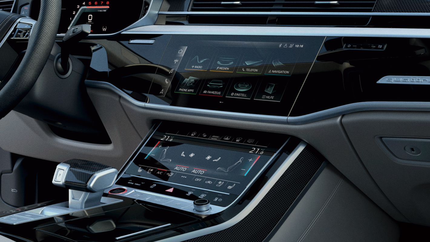 デジタル時代にふさわしいユーザーインターフェースであるMMIタッチレスポンスは、フラットな高解像度モニターで車両のセッティングやインフォテインメントを直感的に操作することが可能。グラフィックや振動、音によって、視覚、触覚、聴覚に明確な反応を感じ取れます。インフォテインメント用の10.1インチアッパースクリーンと、空調操作や手書き文字入力用の8.6インチローワースクリーンの2つのタッチディスプレイを搭載。イグニッションをOFFにするとスクリーンが漆黒のフラットなブラックパネルとなり、周囲のインテリアに溶け込みます。