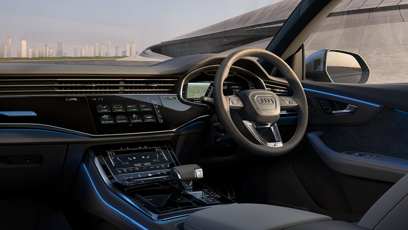 スポーティなディテールを散りばめながらも、くつろぎをもたらすラウンジのような空間。室内の広がりを感じさせる水平基調のダッシュボードに先進のデジタルテクノロジーが融合し、ドライバーオリエンテッドなコックピットを創出。直感的な操作を可能にするMMIタッチレスポンス、S専用の表示モードを備えた視線移動を軽減するバーチャルコックピットプラスなど、運転に集中できる操作性を実現しています。